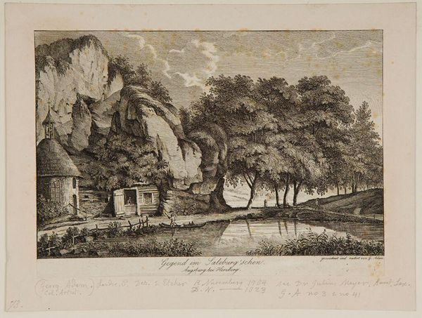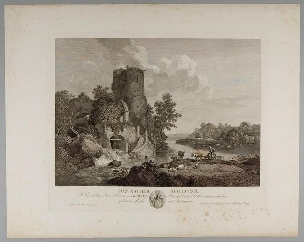 Editor: Here we have Johann Adolph Darnstedt's "Ruins of Kifthaüser and View of the Golden Pasture." It evokes such a feeling of melancholy, doesn't it? What significance might these ruins have held for viewers of the time? Curator: Ruins are heavy with symbolism. They represent the passage of time, the fall of empires, and perhaps even a longing for a lost, idealized past. Notice the figures at the base of the rocks. What feelings do they evoke? Editor: They seem to be resting, maybe contemplating the landscape. Perhaps they are reflecting on history? Curator: Precisely! The ruins act as a tangible link to that history, prompting reflection on mortality and the cyclical nature of civilization. The "Golden Pasture" hints at an Edenic state, now lost. Editor: I see. The contrast between the ruins and the golden pasture creates this tension. Curator: Exactly. The artist uses these symbols to speak to enduring human concerns about loss and the search for meaning within time's relentless flow. Editor: That adds so many layers to what initially seemed like just a landscape. Thanks! Curator: Indeed! It highlights how symbols enrich our understanding of art and history.