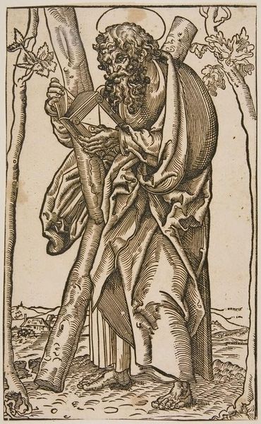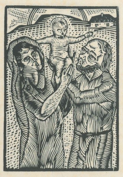 Curator: Today, we're looking at "Nike and the Shepherd Boy," a 1946 woodcut by Hans Orlowski. Editor: My initial response is somber. The high contrast and angular lines give it a stark, almost desolate feeling. It makes me feel an immediate sense of heavy unease. Curator: That tracks with Orlowski’s biography. He faced persecution during the Nazi regime, which profoundly impacted his art. This piece, in particular, speaks to the displaced and marginalized in post-war Germany, reinterpreting classical allegories through the lens of contemporary experience. Editor: Looking closer, I notice the shepherd boy’s gaze. It's averted, melancholic, almost accusatory. The heavy shadowing further isolates him. The texture in the lines— the ways they swell and then diminish, creating the robes of both figures – give a kinetic dimension despite the stillness. What could those varying depths symbolize here, within a semiotic framework? Curator: The Nike figure, a classical symbol of victory, is relegated to the background. Decaying. This speaks volumes about the shattered hopes and the re-evaluation of traditional ideals after such widespread destruction and moral failing. The pastoral setting is ironically rendered; it is far from idyllic, closer to a wasteland. Editor: It's as if Orlowski is dismantling the traditional visual language of heroism. The shepherd boy is not triumphant; he appears burdened. The negative space created by the dark woodcut style actually draws your focus. This stylistic tension generates meaning in itself. Curator: Exactly. Consider the political implications of reviving classical iconography in such a subversive way in post-war Germany. By presenting victory and the heroic in ruins, Orlowski offers a powerful indictment of the systems that led to such profound human suffering. Editor: It prompts me to consider art's purpose amidst political turmoil: as witness, as resistance, or perhaps as a space for collective mourning. Thank you. This piece and your analysis offer a valuable perspective on that complex dynamic. Curator: And for highlighting Orlowski's skillful technique that delivers so much of that emotion! An affecting piece, and an important reminder of art’s capacity for both reflection and critique.