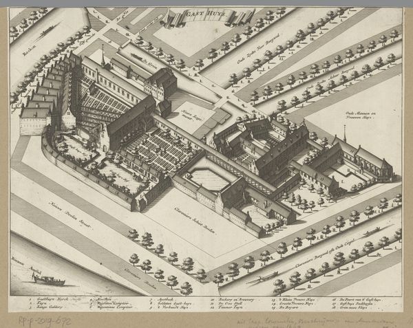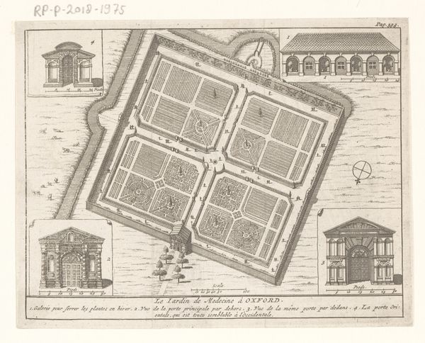 Julius Milheuser created this detailed rendering of "Gezicht op Huis ter Nieuburch in Rijswijk" using ink on paper. The composition is dominated by a high, almost aerial perspective, meticulously mapping out the architectural and landscape elements. Notice how the geometric precision used to depict the gardens and buildings creates a sense of order and control, typical of formal garden design. The use of line is particularly striking. The lines define the structures, pathways, and even the patterns within the gardens. The scale is manipulated to show both the overall layout and minute details, offering a comprehensive view of the estate's design. This combination of precision and detail functions beyond mere representation. It reflects the values of the time, where nature was sculpted to reflect human intellect and power. The structure is more than aesthetic; it's a cultural statement about humanity's ability to impose order on the natural world. We might consider how such designs served not only as spaces of leisure but also as symbols of authority and social standing.