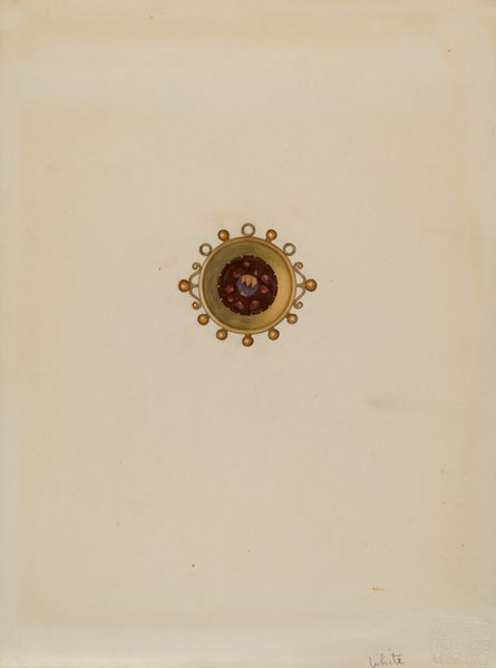 Curator: What strikes you first when you look at this, the *Hair Brooch and Ring*, a watercolor and drawing on paper by William P. Shearwood from around 1936? Editor: Well, there's a definite stillness to it. They're static objects on a very blank page. But also, there is such fine, exacting detail—somebody wanted to truly record these. Curator: Absolutely. In the context of the time, mourning jewelry containing the hair of a loved one was a common practice. This artwork gives us such an intimate peek into both fashion and culture, you know? Preserving remembrance and all. Editor: Ah, the Victorian sentimentality, I'm getting that strongly now. Knowing that the jewelry features hair, and the care in depicting them is... it feels both loving and a little unsettling. Like keeping a memento mori close. But more intimate somehow. Did only women wear it? Curator: Jewelry such as brooches was not restricted to any gender. Its ubiquity reminds us of its vital role in signaling social status and commemoration across genders in past eras. Editor: True! Thinking about the labor that went into making the physical objects versus making *this*, a sort of drawing from observation—both have labor and meaning attached to them, a double encoding if you will. Curator: It makes me ponder, though, the relationship to photography in all this. Photography was common by the time of this work, so why depict such everyday artifacts in this medium? Watercolor, particularly, allows the expression of unique textures and details! Editor: Hmmm. Well, maybe the hand-done-ness adds another layer, like a personal filter over the cold lens of a camera. Someone took the time, not just to remember, but to *see* and re-create the beloved object. And now we can see it, too, generations later. Curator: What I'll really take away today is just this glimpse into the quiet, yet potent symbolism embedded within seemingly everyday things. So delicate! Editor: Yes, objects holding stories, interpreted, represented, reframed, endlessly resonant. Very cool indeed!
