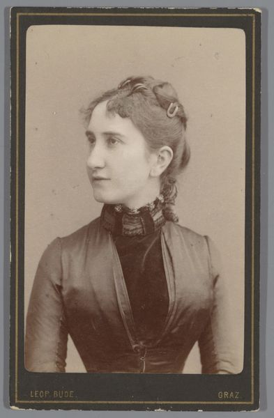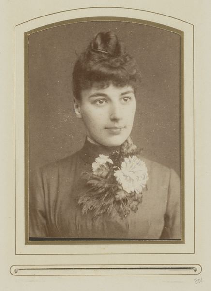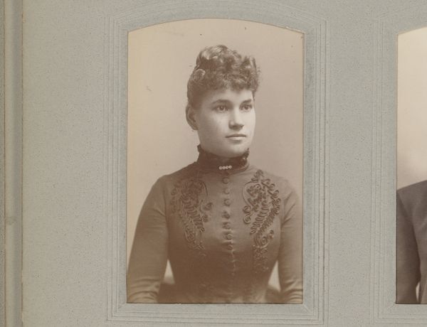 This is a carte-de-visite, a small photograph popular in the 19th century, depicting an unknown young woman, made by Deton-Cornand in Mons & Charleroi, Belgium. These cards were part of a booming industry tied to the rise of photography and a growing middle class. Looking closely at the woman's attire, the high-necked dress, the elaborate hairstyle, and the delicate brooch, we can infer she belongs to a certain social class. But what does it mean to be an unknown woman memorialized through photography? The lack of specific identity invites us to project our own interpretations and emotions onto her. The image prompts us to consider the lives of women during this period, their roles, expectations, and the narratives that often went unrecorded. While this portrait adheres to some conventions of the time, it also hints at individuality. There’s a sense of quiet confidence in her gaze. It makes you wonder: what was important to her? How did she see herself? This small photograph captures not just an image, but a complex moment of history, identity, and human connection.