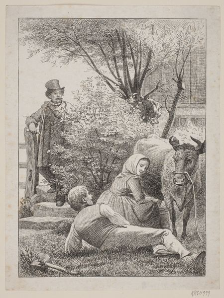 Curator: Well, this looks chaotic! There's a sense of immediate drama in the scene with the turned-over carriage and the figures scrambling away. Editor: Indeed! We have here a drawing, made with pencil and ink, by Gijsbertus Johannes van Overbeek, sometime between 1892 and 1947. The work is titled "Jongen en meisje vallen uit een wagen," which translates to "Boy and Girl Falling from a Wagon." Quite literal, isn't it? Curator: More than literal – the wagon being pulled by a goat suggests it's playing on a symbolic level. Goats are, well, goaty! Editor: Absolutely. In various traditions, goats represent stubbornness, capriciousness, and even a kind of rebellious energy. Perhaps Overbeek is using the goat as a visual metaphor for uncontrolled childhood, a sort of barely tamed innocence leading to accidents. Look at the figures fleeing—are they fearfully amused? Mortified by embarrassment? Curator: From a social history angle, I’m drawn to the setting. The middle-class home, with the imposing gate, shows a society where order and control are important, and the genre-scene setup feels very deliberate. Is this an imagined story about reckless youth endangering domestic tranquility? Or is Overbeek trying to suggest social chaos lurks beneath the surface of bourgeois life? Editor: Possibly both. Visually, the composition funnels your eye from the fallen children toward the running adults. This almost cartoonish chase, this lack of composure, suggests something unexpected has disrupted their routines. We see similar frantic chases visualized in earlier Baroque allegories of vice. Curator: So you see continuity even as the style nods toward Realism? Editor: Yes, though the slightly academic drawing style also reflects the period. This piece participates in a longer dialogue, re-employing recognized visual themes to convey an instantly understandable moral lesson for a popular audience. The goat isn't just pulling a cart—it's embodying human impulsiveness. Curator: Looking at it now, you’ve highlighted the art-historical implications of these seemingly simple motifs. My initial reaction to chaos transforms into an awareness of how deliberate the work truly is. Editor: Precisely. I started out just seeing what any viewer might see, and now I’m remembering that this work, on second inspection, has symbolic connections to so many different past artworks.