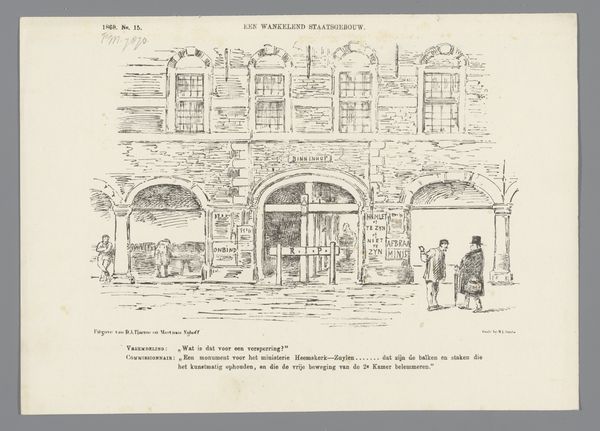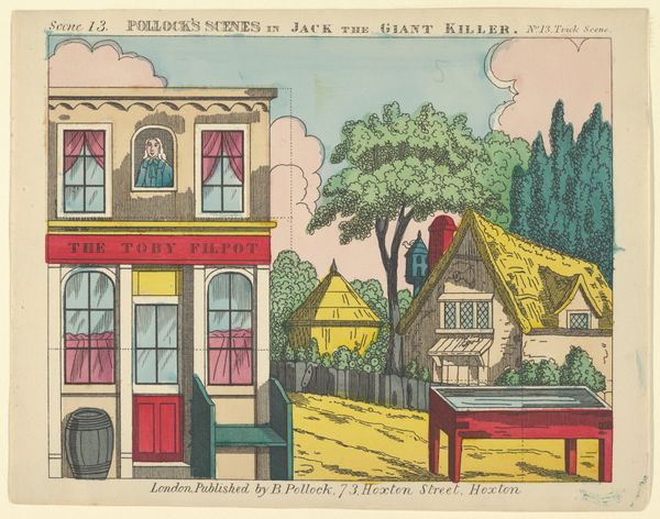 Editor: This print, "Scene 9, from Jack and the Giant Killer, Scenes for a Toy Theater," likely dating from 1870 to 1890 by Benjamin Pollock, presents a quaint street scene. I’m struck by how ordered and theatrical it feels, like looking at a stage set. How do you interpret this work in its historical context? Curator: It’s crucial to acknowledge that this print exists within a lineage of popular entertainment designed for domestic spaces. These "toy theaters" weren't simply children's playthings. Consider how the rise of consumer culture in the Victorian era intersects with notions of domesticity and gender roles. The miniature theater allowed families, particularly women, a sanctioned space for creativity and perhaps even subversive performances within the home. Notice the spirit merchant and surgeon – how might these professions, visually presented, speak to anxieties and realities of Victorian society? Editor: That’s interesting! I hadn't considered the performative aspect and how that might relate to gender. Were these kinds of prints widely accessible? Curator: Access would depend on socioeconomic standing, but the mass production of such prints suggests a fairly widespread appeal. Think about the role of spectacle and visual culture in shaping societal norms. What stories are being told, and who has the power to tell them? Is there anything about the figure of "Jack" or the giant that might hint at broader social or political commentary? Are these stories ways of negotiating class anxieties, national identity or gender dynamics? Editor: It’s fascinating to think about this seemingly simple print as a site of complex cultural negotiations. I initially saw it as charming but now appreciate how it reflects so many different aspects of Victorian society. Curator: Precisely! It’s about recognizing the inherent complexities within the everyday, and understanding how seemingly innocuous objects can reveal much about the social fabric from which they emerge.