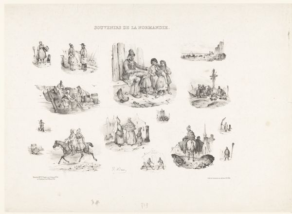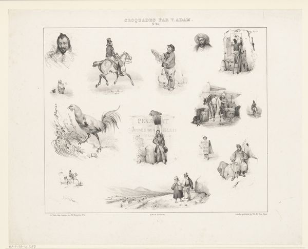Curator: Welcome. Before us is “Negen voorstellingen van menselijk tijdverdrijf en diverse dieren,” or “Nine Scenes of Human Pastimes and Various Animals,” an etching by Victor Adam, dating to 1837. Editor: Oh, it’s wonderfully whimsical! Like a sheet of stamps before they’re peeled off. A whole little world of leisure condensed into a single frame. It feels lighthearted and very… French! Curator: Precisely. The print presents us with nine vignettes – each showcasing people engaged in various leisurely activities alongside animals, reflecting the burgeoning interest in genre painting and depictions of everyday life during the 19th century. I am immediately drawn to how Adam is exploring themes of leisure within a society rapidly undergoing industrial change. Editor: It's funny though, looking closer. A few scenes feel very staged, or even a bit dark. See the rider in the lower center – seems rather… desperate for escape? And the figures in the bottom right look trapped, almost theatrical. I do love that tiny boy kicking a ball though – the epitome of pure, unadulterated joy! Curator: Perhaps that darkness you perceive reflects a tension between idealized rural life and the social realities of the period? These weren't all necessarily “pastimes” for everyone involved. The print medium also hints at a world of increasing consumption and affordability of images for a growing middle class. Editor: Hmm, valid. It's fascinating how he crams so much detail into these miniature worlds using the etching technique. All of it so delicate... Like a spider's web! How readily these light lines betray a world about to break. Curator: Consider also how Adam, as a printmaker, made his living. The reproductive nature of printmaking meant this imagery could be widely circulated, potentially impacting ideas of leisure and social status amongst different societal levels. Editor: It all makes the "pastimes" on offer appear more like aspirational lifestyle advertising – though I doubt they used the term then! This makes me question which parts of these scenes he witnessed, or truly believed. Curator: An interesting provocation indeed. Editor: This little gridded dream offers a window into the societal hopes and hypocrisies of its time. A playful reminder that ‘leisure’ is not always as effortless as it appears.