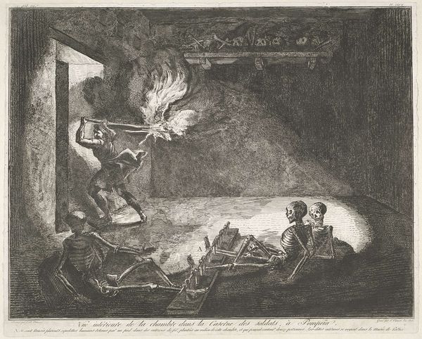 Curator: This etching by Francesco Piranesi, created in 1805, gives us "Another View of the Interior of the Room Belonging to the Country House, Where Preparations are Being Made for a Hot Bath in Pompeii." What jumps out at you? Editor: Starkness, mostly. The light and shadow create such intense contrasts that it almost feels theatrical, a stage set awaiting actors. But there’s something deeply unsettling about these geometric forms, especially that enormous cauldron dominating the scene. Curator: Exactly! That tension between the familiar and the uncanny is, I think, key. Piranesi is drawing on Neoclassical interest in antiquity, yet it is far removed from history painting, in this work, though categorized as that as well. There’s a focus on mood, an evocation of daily life that the figures help with – two men at the left side preparing the sacrifice of sheep as offering before entering into the warm bath. Editor: Sacrifice, or butchery…it's unsettlingly casual, part of the ritual but so ordinary as to border on mundane. Symbolically, that cauldron evokes hearth and home, feminine energy, but its scale tips it into something imposing, almost sinister. Does it symbolize an attempt to purify, a necessary ritual, or simply inescapable domesticity? Curator: That’s wonderfully put! I do wonder what Piranesi would say about these ideas, if he was still alive to share. One other thing is that with these lines, he shows us that everything is crumbling into the earth. Ruins in 1805 was definitely considered something Romantic. Editor: It resonates through time; even today, after all these centuries! Thanks, this one is staying with me. Curator: Agreed, it will sit at the back of my mind for a long while also. Thank you for taking a fresh look together.