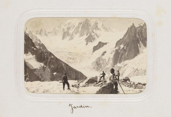Editor: So this is 'Wandelaars steken het Mer de Glace over bij Chamonix', a gelatin silver print by Auguste Garcin, predating 1880. It shows a group crossing a glacier; the figures seem almost tiny compared to the landscape. What strikes you about it? Curator: I see a photograph that reveals a particular mode of 19th-century tourism intertwined with emerging industrial practices. Notice how this expedition is being documented, almost commodified. The labor involved, from producing the photographic materials to guiding these tourists, becomes part of the experience, packaged and sold. Editor: I hadn't thought about it in terms of labor... Could you elaborate on that a bit? Curator: Consider the gelatin silver print itself. It wasn't conjured from thin air, it depended on factories producing the necessary chemicals, the infrastructure to get it here and the photographers to set up their studio and venture to dangerous, difficult to reach locations, producing these views to fulfill demand for tourism and its memory keeping. The act of traversing this landscape became, in part, a spectacle, a consumable image destined for someone's album or perhaps a commercially reproduced souvenir. Even their clothing represents significant material investment! Editor: That makes so much sense! Seeing it now, this photo isn’t just a simple landscape; it captures a moment where nature, labor, and early industrial consumerism meet. So, this ties into Romanticism through tourism but critiques the way it’s consumed? Curator: Precisely. This photograph, as a manufactured object and an image of curated experience, reveals how even our encounters with sublime nature were already mediated and marketed in a nascent industrial age. What appears "natural" here required very artificial processes. Editor: Wow, that gives me a whole new perspective on landscape photography. I never would have looked at it this way! Curator: Examining the photograph in this way forces us to challenge idealized views of both nature and art itself.