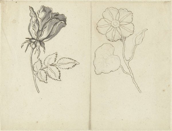 This pencil drawing, "Bloem- en bladstudies," by Franz Jakob Kreuter presents us with a delicate study of botanical forms. Kreuter arranges a collection of flowers and leaves across the paper in a seemingly informal manner. The precision of line, however, suggests a deeper structural investigation. Each plant is meticulously outlined, capturing the essence of its form. Notice the careful attention to the curvature of petals and the veining of leaves. The artist uses a light touch, creating a sense of transparency and lightness, as though we are observing these plants in a gentle breeze. Kreuter’s approach can be seen as a kind of visual taxonomy, cataloging nature’s forms. Yet, by isolating these studies from their natural context, he invites us to consider the abstract qualities of shape and line. Each study becomes an exercise in seeing, a meditation on the underlying geometry of the natural world. The drawing, therefore, functions not merely as a representation, but as a structural exploration.