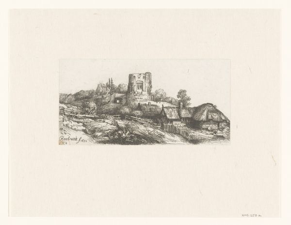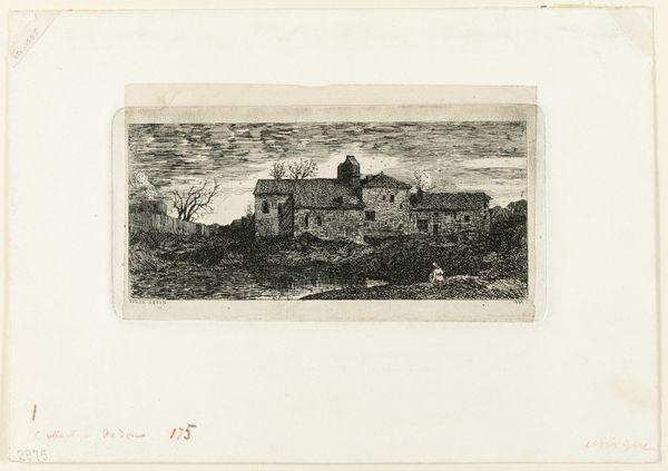 This is "Huis waartegen vaten opgestapeld liggen", made by Israel Silvestre. It is an etching. Upon first viewing this etching, we see a landscape dominated by architectural forms. The buildings, with their sharp lines and solid shapes, create a sense of structured space. Yet, this order is softened by the textures achieved through etching; the rough surfaces and varied line weights introduce an element of the organic into the geometric. Silvestre uses linear perspective to create depth, drawing our eye along the buildings and into the distance. The composition is arranged to contrast the solid, weighty structures with the open sky, creating a visual tension. This contrast invites us to consider how we perceive space and form. Is it about boundaries and definition or about openness and the possibility of extending beyond the seen? Notice how the materiality of the etching itself, the etched lines and their arrangement, become integral to the artwork’s language, enabling Silvestre to express ideas about structure, space, and our engagement with the built environment. This complex interplay of form and material ensures the artwork remains relevant for ongoing interpretation.