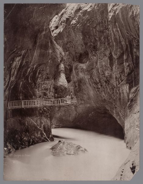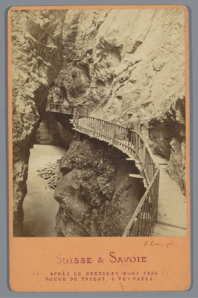 Curator: This delicate work is entitled "Bridge Through the Trient Gorge near Martigny, Switzerland". Ernest Eléonor Pierre Lamy created it around 1868, employing watercolor and colored pencil. Editor: Right away, it evokes a feeling of being lost, but safely lost, you know? It's as if I stumbled upon some secret, forgotten passage carved by giants. That bridge seems so fragile, a temporary dare amidst the permanent stone. Curator: Indeed. The choice of medium—watercolor and colored pencil—contributes to this sense of ethereal impermanence. Landscape prints such as this circulated widely, especially amongst early tourists keen to possess an affordable memento of the sublime landscapes of Switzerland, making them popular despite the technical difficulties of early photographic reproduction. Editor: Sublime indeed. There is also that striking tension, actually. Like, "yeah I feel good, but just a wrong step, and splash!". Does the bridge itself perhaps have any further symbolism here, reflecting maybe society's role between individuals? Curator: A possibility. In 19th century Europe, infrastructure projects were loaded with social and political meaning, being an evidence of economic progress but also social connections across remote communities. These alpine crossings literally embody an aspiration of easy and secure communication, a theme already explored in artistic depictions of bridges and tunnels, and whose representation gained popularity amid technical progress and industrialisation. Editor: Fascinating! And to consider the artist carefully building up the gorge in layers of watercolor— each wash creating depth and atmosphere, a whole story! It does really create a lasting memory for that adventurous tourist in mind. Curator: Precisely. And for us today, it reminds us of the continuing interplay between nature and technological advancement, as it has defined much of our history. Editor: Looking at the bridge and watercolours again, they make me feel all meditative about travel, society, progress - everything, simultaneously! I would certainly get this print for my house and to remember those thoughts! Curator: An appropriate response, I think. It highlights how seemingly straightforward depictions can embody multifaceted meanings.