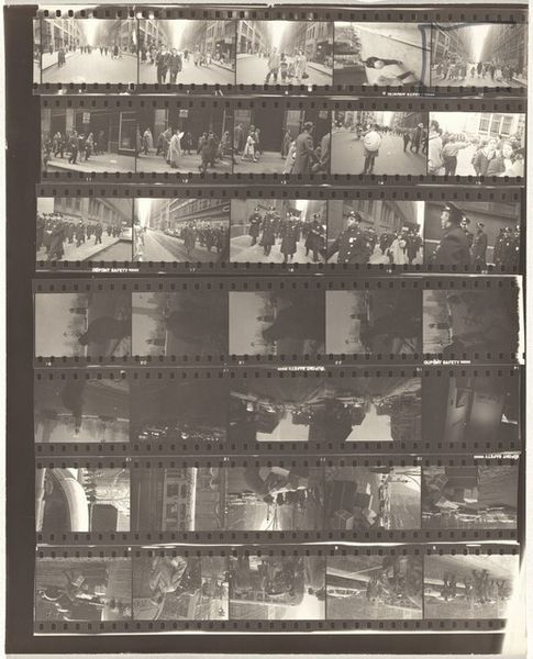 Curator: Here we have Robert Frank's contact sheet, titled "Doll--Early New York City no number/Black White and Things 26," created in 1949. It’s a gelatin-silver print, showcasing a modernist approach to street photography. Editor: Immediately, I’m struck by the sheer amount of captured moments. It's almost overwhelming—a visual diary documenting post-war New York City life. You can almost hear the chatter of the crowds in Times Square. Curator: Indeed. The contact sheet format is crucial. Frank wasn't presenting a single, perfect image, but rather the entire process of capturing those moments. Note how each frame offers a slightly different angle, a different expression, a different arrangement of the bustling crowd. It underscores the photographer's act of making. Editor: Absolutely, and understanding the time period enriches our interpretation. New York City after the Second World War was a locus of consumer culture and burgeoning social tensions, reflected in this dynamic street life, public celebrations, and perhaps also by the mass production methods inherent in photography at that time. How do you see that playing out in this piece? Curator: The very nature of street photography as it developed at this time allowed for a form of raw documentation previously unseen, or at least not disseminated widely. Frank captured the daily existence of the city dwellers without pretense, framing people interacting with a new sense of freedom and social uncertainty as post-war life took shape. These smaller frames become important documents of that time. Editor: And think of where the images might have been shown. Galleries, magazines, newspapers... each context shaping how this raw documentation would be interpreted by the public. Did this more raw aesthetic challenge conventional portraiture in fine art circles? Curator: Certainly, by bringing his street photography into art galleries and books, Frank shifted the traditional high/low art dynamic. Here was work focusing not only on candid depictions but also implicitly reflecting back the culture that produced them. This approach made the artistic experience of the masses newly visible within formal settings and collections. Editor: Looking at the whole work, from the film edge markings to the notation of "missing," what we get is an intimate and intriguing artifact. We are left feeling invited behind the scenes of photography itself. Curator: A potent observation. This one contact sheet reflects Frank’s process while mirroring, too, the culture industry that framed his lens on mid-century New York.