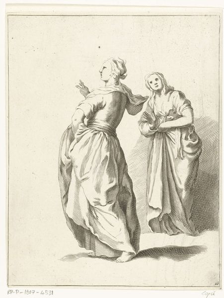 This delicate print, "Two Women" by Frederick Bloemaert, made in the 17th century, captures two figures draped in classical robes. The woman above rests her head in her hand, a pose laden with melancholy, while the figure below reaches out with an open palm. Consider the 'melancholy' pose—it echoes across time, from classical sculptures of grieving figures to Renaissance depictions of contemplative saints. This gesture, a universal language of sorrow, finds its roots in ancient Greek and Roman art, where similar poses expressed deep emotional states. Now, let us turn to the open palm. In antiquity, this was a sign of supplication or innocence. It can be traced from ancient Egyptian art through Christian iconography, where it signifies honesty, openness, and a plea for divine mercy. How fascinating that the artist combines this with the melancholy pose! These motifs, drawn from the deep well of cultural memory, transcend time, engaging us on a subconscious level and stirring profound, timeless emotions. Through Bloemaert’s art, we see how images evolve, resurface, and acquire new layers of meaning across historical epochs, reflecting our shared human experience.