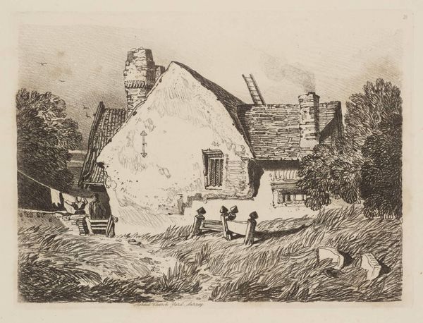 Curator: Rosalie Holm created this print, “Schweizerhus,” in 1833. It's a wonderful example of early 19th-century etching and engraving. Editor: My first impression is how evocative it is, like stepping into a fairy tale! The detailed textures, especially on that thatched roof and stone facade, give it a palpable, almost tactile quality. Curator: Absolutely, and I think that reflects a growing Romantic interest in vernacular architecture, looking back to these building styles for notions of "authenticity," especially within a burgeoning tourist market eager to experience the "genuine" Switzerland. Editor: Yes, there's that symbolic resonance! The house almost becomes a character. The plumes of smoke from the chimney suggest hearth and home, tradition and permanence. It evokes those feelings strongly. Curator: It's interesting to consider the medium too; the lines of the etching capture this feeling, but this print form also helped distribute this specific image of Swiss identity on a wider scale. Remember, Switzerland was itself solidifying as a nation at this point in history. Editor: I also notice the two sculpted horse heads adorning the roof's peak, a sign perhaps relating to traditional folklore or even spiritual protection. The building, in essence, visually proclaims its history and belonging. It anchors it to a past. Curator: Precisely, that echoes larger debates at the time regarding Swiss independence. Were they tied to these symbols? Where did this visual history fit in a nation rapidly changing politically? We can certainly see Romantic ideals being promoted, with landscape and buildings entwined. Editor: It makes you wonder how conscious the artist was of all of those layers of meaning, and also how later generations, including us, might interpret and re-interpret that rich symbolism through history. Curator: A good question indeed. Hopefully, these reflections have given you fresh perspectives on "Schweizerhus," prompting questions on the meaning of identity in a historical context. Editor: It certainly speaks of home, history and how these feelings connect through generations.