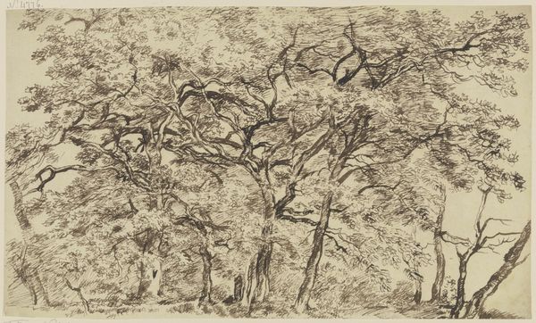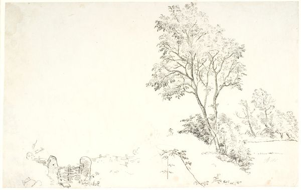 Curator: So, tell me, what jumps out at you first about this etching, titled "Aesacus and Hesperie"? Turner might have made it around 1816, and it's ink on paper. Editor: It’s melancholy, isn't it? That lone figure by the water... almost dissolving into the landscape. The spindly lines remind me of memories fading, like a dream you can’t quite grasp. Curator: Indeed. Turner was deeply engaged with classical narratives, and this piece depicts the myth of Aesacus and Hesperie. See how the composition is structured? We've got the embracing, overarching trees, their forms echoed by the drooping willows – creating a sense of enclosure around these two figures. A mirroring or reflection? Editor: Reflection is key here, I think. Looking at the formal composition—the light, almost sketch-like rendering… the figures appear subjugated by nature's complex web. Is the subject nature’s indifference to human suffering? Curator: Perhaps. Or maybe it’s the romantic ideal of being consumed by nature! Turner frequently explored such dramatic, emotional themes. His use of line—the frenetic energy—conveys turmoil. Aesacus, upon seeing Hesperie die from a snake bite, plunges into the water. The trees almost feel like they're weeping. Editor: Exactly! I read the scene as overtly grief-stricken; a sense of dramatic emotional release. What appears formally as loose brushwork helps underscore the overall scene's chaos and heightened distress, right? The eye doesn’t find rest, jumping from figure to overhanging branch to foliage! Curator: Right, the lack of finish only adds to its emotional power, heightening the narrative drama by way of an almost abstracted or suggestive approach to landscape depiction. Well, thank you for walking us through the work in all its dramatic visual splendor. Editor: Always a pleasure to tease out the story hidden in the lines. It’s funny how such simplicity of form yields complexity of feeling, right?