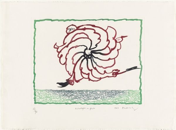 Curator: This woodcut print by Jasper Johns, simply titled "Untitled," was created in 2000. It showcases an interplay of geometric abstraction, rendered with sharp contrasts. What strikes you about it initially? Editor: There's something immediately unsettling yet captivating in its simplicity. The bold blue background, juxtaposed against the stark white figure, almost feels confrontational. It pulls me in despite, or maybe because of, the lack of conventional beauty. It is so crisp. Curator: Consider the context. Johns emerged during a time of shifting social values and evolving notions of identity. We should explore how printmaking functions as an accessible and democratizing force. Do you find that's relevant here? Editor: Absolutely. Printmaking's inherent reproducibility dismantles the aura of the unique art object, offering avenues for wider participation. Think about Johns' use of iconic, readily recognizable motifs in other pieces: it subverts notions of elitist art and brings the focus back to lived experience. And even in this, perhaps his most abstract work, there's something fundamentally approachable and common to us. I also note that "Trial Proof" is etched at the bottom of the print: in this form it has a rare quality despite existing in print form. Curator: I'm curious how his work plays in the socio-political realm, and how our institutions enable or disenable accessibility. It's intriguing to examine how an artist engages in political and social change through such an accessible format. Editor: The fact that it is abstracted makes it open to interpretation by anyone, regardless of their background. Curator: Indeed, his conscious decision to veer towards geometric shapes rather than familiar emblems perhaps serves as a commentary on the expectations surrounding his work. What are his constraints, then, from outside actors versus self-imposed? Editor: It becomes more interesting to question, isn’t it? A statement, but not in the traditional sense. Thank you. Curator: A piece that inspires reflection, especially when we engage in dialogues around artistic intention and societal impact.