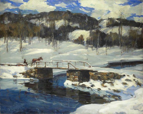Editor: This is "Tiergarten im Winter" by Lesser Ury, painted in 1892. It seems to be an oil painting and it immediately evokes a sense of chilly quietude. I am curious: How do you interpret this work with its striking use of color and form? Curator: Indeed, let us observe. Note the predominantly cool palette – violets, blues, whites – used not to realistically depict winter light, but rather to convey a particular mood, an emotional state. The structure relies less on accurate representation and more on the juxtaposition of color fields. Consider how the strong horizontal of the bridge intersects the verticality of the trees. Editor: So the emotional impact is key? The color palette doesn't mimic a real-world observation. Curator: Precisely. The artist utilizes colour to create planes, which, in turn, fashion the scene, so there’s both depth and flatness. One could read into the painting a network of formal tensions, using, for example, semiotic frameworks of binary opposition such as warm versus cool, light versus dark, soft versus hard... Editor: It’s almost like Ury uses these formal elements to create his own distinct version of this common landscape. Curator: Correct. The interplay of those compositional elements elevates it beyond a mere depiction of winter. Through line, color, and form, he articulates something altogether more abstract and complex, drawing viewers into a world predicated on the formal qualities that define it, and leaving us with new formal possibilities. Editor: I appreciate how analyzing those choices emphasizes the artist's active role in shaping what we experience. Curator: And hopefully offers a toolkit with which to better analyze works and engage the discipline of art history.