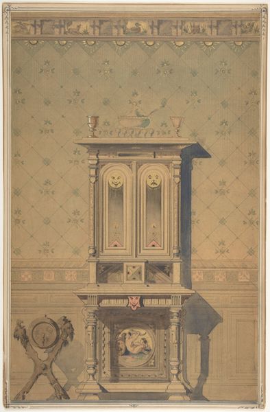 Curator: Looking at this, I immediately think of formal dinners and hushed conversations. There’s something about the symmetry and the muted palette that speaks to controlled elegance. Editor: Indeed. What we're seeing here is a design drawing by Jules-Edmond-Charles Lachaise, dating from around 1830 to 1897. The piece, currently housed at the Metropolitan Museum of Art, envisions a room adorned with garland motifs of fruit and flowers, scrollwork, and latticework, all rendered in watercolor and print. Curator: The garlands certainly evoke a sense of bounty, a celebration of nature contained within the domestic sphere. The fruit especially carries connotations of harvest and prosperity, almost a prayer for continuing good fortune displayed on the walls. Editor: Precisely. The incorporation of such classical elements like scrolls, the emphasis on balance and order—it firmly places this design within the Neoclassical tradition. It's interesting to note how Lachaise is not merely decorating a room, but seemingly constructing an ideology. Curator: That latticework along the upper wall… it gives me the impression of a structured foundation but the interwoven form hints at underlying societal relationships. And then framing this entire system are those vases, almost like focal points around which ideas collect, acting like an object for symbolic reverence. Editor: The doorways too are fascinating, not just portals but actively shaped by ornamentation that suggests passage is not simply physical, but ceremonial, transitioning to spaces of importance or ritual. I note the composition invites visual entry and exit. Curator: You're right; they demarcate movement both physically and, dare I say, spiritually. This space doesn’t just enclose; it guides, tells a silent narrative. There’s also an interesting tension. It seems formal but almost verges on excess. The symbols feel less potent as singular figures and the arrangement creates something with many messages and a singular absence. Editor: I concur. The work provides much fodder for thinking about decorative arts as not only beautifying elements but active conveyors of status, memory, and aspirational values. Curator: Yes, a snapshot of a world trying to cultivate permanence and pleasure, meticulously planned. Editor: Absolutely. The materiality, the application, speaks volumes about aspirations of grandeur in even the private domains of life.