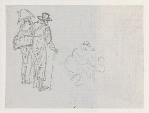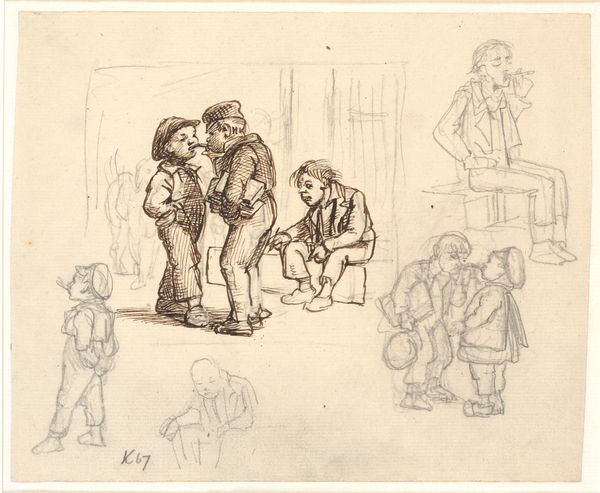 Lorenz Frølich created this pencil drawing on paper, whose title translates as 'sequence of standing men, woman with child', sometime during his career. It's held at the Statens Museum for Kunst. The image, divided into two distinct registers, hints at a commentary on Danish society during the 19th century. In the upper section, a diverse group of men is depicted, each distinguished by their attire, suggesting varying social classes, while to the right, we see a women holding a child. Below, a more indistinct scene unfolds, possibly of labour, with a figure on the left, also in working clothes, looking on. The artwork prompts questions about social structures, gender roles, and economic realities within Danish culture at the time. Is it conservative or progressive? To gain a richer understanding, one might explore Danish social history of the period, investigating class divisions, gender expectations, and the impact of industrialization. The museum archives could reveal more about Frølich's other works and his social position. The meaning of art, as we see, is contingent on its social and institutional context.