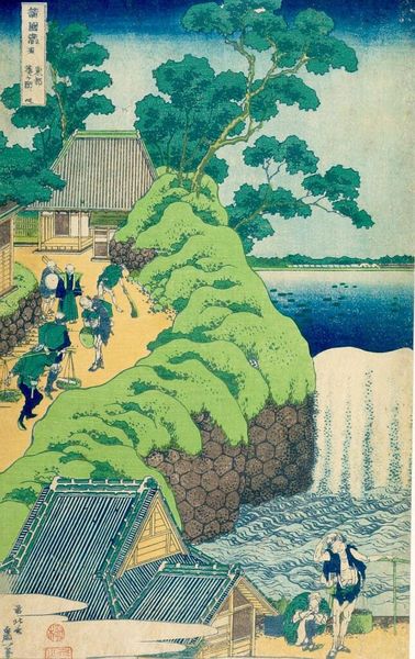 Curator: This is Utagawa Hiroshige's "Mokuboji Temple, Uchigawa Inlet, Gozensaihata" from his series, "One Hundred Famous Views of Edo." Editor: It feels like a dream, doesn't it? The water shimmering, the bridge fading into the distance… a tranquil escape. Curator: Woodblock prints like this democratized art. Hiroshige captured Edo's popular spots, transforming everyday life into affordable art for the masses. Editor: Water is a recurring symbol, and the figures by the water might represent cleansing, transition, or perhaps simply the flow of life itself. Curator: The location itself held significance; the Mokuboji Temple was dedicated to Kobo Daishi, a revered Buddhist monk who impacted Japanese arts and learning. Editor: The pine trees, often symbols of longevity, frame the scene, giving the impression that this tranquil scenery is timeless, a constant source of reflection. Curator: And Hiroshige was commissioned by a publisher to make these, showing us the art market and the economic structures supporting art production. Editor: Looking closely, the layering of water, land, and sky reminds me of the interconnectedness of nature. I think there's a deeper invitation to contemplation here.
