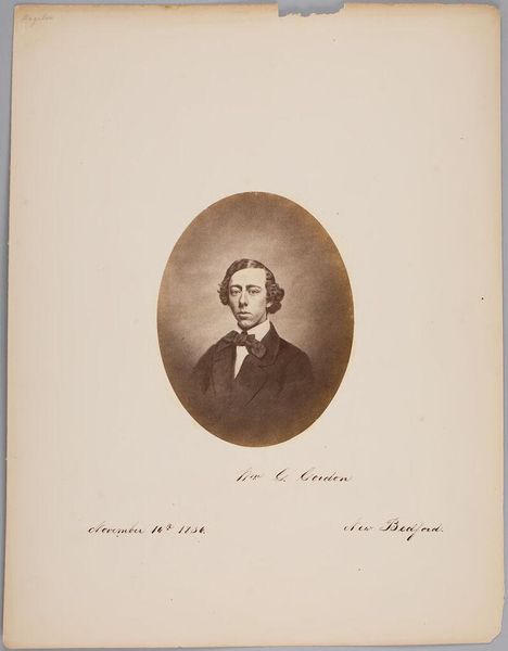 Curator: Let's dive into this portrait of Samuel Pasco by John Adams Whipple. It's a fascinating look into early photography, isn't it? Editor: It really is. This portrait, probably from the 1860s, has a quiet elegance to it. I'm curious, what does it tell you about the period's approach to portraiture? Curator: Well, think about the context. Photography was still relatively new. The formal pose, the oval framing—it mimics painted portraits, signaling status. Note the inscription beneath the image: "June 28th, 1834" and "Cambridge." What does that suggest to you? Editor: Perhaps that's the date he graduated from Harvard? Curator: Precisely. This photograph becomes a record of academic achievement, a way to solidify Pasco's place in Cambridge society. Photography, then, isn't just about capturing a likeness; it's about shaping a public image. Editor: So, it's about societal role as much as individual identity. I never thought of it that way. Curator: Exactly! It highlights the social and institutional functions that even early photography served.