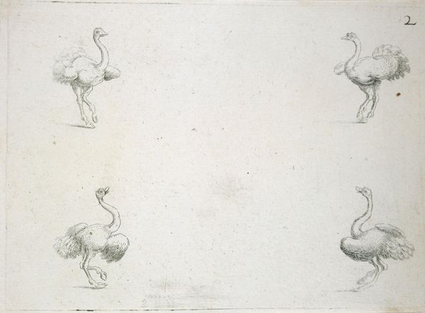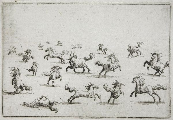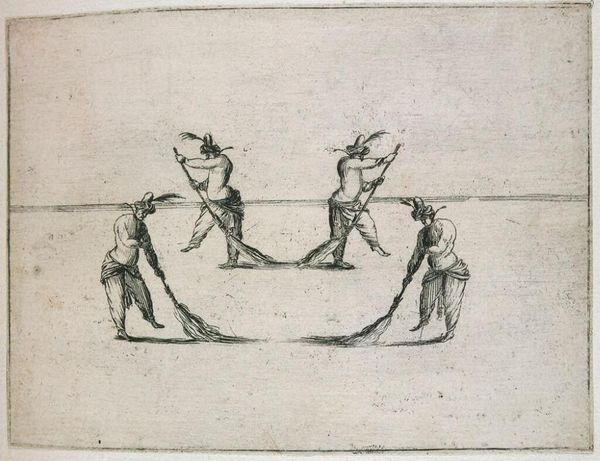 Editor: Here we have Valerio Spada's "Plate IV, Four Bear Trainers with Bears," part of the "Ballet of Bears with Parrots" series. It's a small etching, about 10 by 14 centimeters. I find the image so strange. What do you see in it? Curator: Well, consider the bear itself, throughout history. It represents both untamed nature and a spectacle for entertainment. In Spada's time, trained bears were a common sight, yet the image carries symbolic weight. The chains, the trainers' attire... what stories do they evoke? Editor: I guess it's a reminder that these animals were exploited for entertainment. I hadn't thought about the trainers' costumes as symbols of authority. Curator: Precisely. It's a commentary on power dynamics, isn't it? Even in what seems like a lighthearted ballet, the image resonates with deeper, perhaps darker, meanings. Editor: I see your point. It's more than just a ballet scene; it reflects cultural attitudes towards animals and performance. Curator: Indeed. Symbols hold so much more than meets the eye.