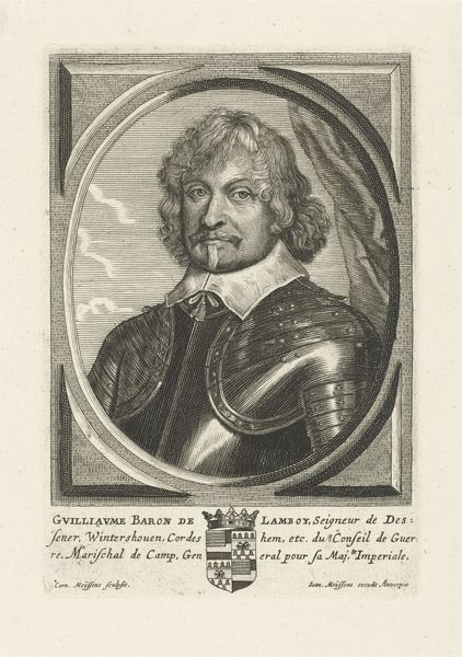Curator: We're looking at "Portrait of Guillaume de Lamboy," a print made in 1649 by Pieter de Jode the Younger, currently housed in the Rijksmuseum. It's an engraving, quite detailed, of a man in armor. Editor: Yes, the engraving creates such intricate textures, particularly in the armor and lace collar. It has an almost…stark feel because of the monochromatic palette. What do you see when you look at this print? Curator: I'm struck by the use of line. Notice how the density and direction of the engraved lines define form and texture, moving to build the tonality of the face, creating this impression of realism and weight, countered with decorative and framing elements around him. Do you see the shapes created? The perfect ovals for the portrait's border as compared to the architectural corner. Editor: I see how those juxtapositions highlight the contrasting textures within the piece itself, between the smoothness of the face and the rigid, almost sculptural, quality of the armor. Curator: Precisely. The artist skillfully manipulates light and shadow through these lines, guiding the viewer's eye. Consider the semiotic weight. What message does the artist embed with the perfect versus imperfect forms? Does it express stability and power, or internal dissonance and strife? Editor: So, analyzing it this way helps us understand not just what is depicted, but how the artistic choices create meaning beyond the subject. It makes me look beyond just the representation of the person and look deeper into the symbolic structures. Curator: Precisely!