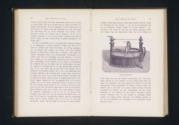 Curator: This image shows two men working a plate-printing press, taken from a book published before 1892. It's interesting, but I'm most interested in the socio-economic factors surrounding its production. Editor: It's a rather mundane scene, capturing labor. What grabs you about it, particularly? Curator: Look at the tools, the press itself. Consider the labor involved in producing not just the image, but the printing press itself and even the book it comes from. The division of labor is implied in the poses and actions of these men: one prepares the plate, while the other operates the machine. Where does the production of prints fit into the social fabric of the time? Editor: So you're seeing beyond the surface image to the entire system that brought it into being? Curator: Precisely. These figures, seemingly caught in a simple work scene, were integral parts of a production process fueled by an emerging industrial economy. This print gives us a glimpse of that specific moment. What about you? What meaning do you find in the book itself? Do you see it primarily as an instructional resource? Editor: I initially saw it more as a historical snapshot, a peek into a past profession. But thinking about it as part of a larger system of production adds depth. Curator: Indeed, it's through understanding the materiality of this print – its very existence as a manufactured object – that we can unpack a larger story about work and technology in that era. Editor: It gives us more context, considering its function in society. Curator: Absolutely. Thinking of it that way enhances its importance. It ceases to simply be a nostalgic look at the past.