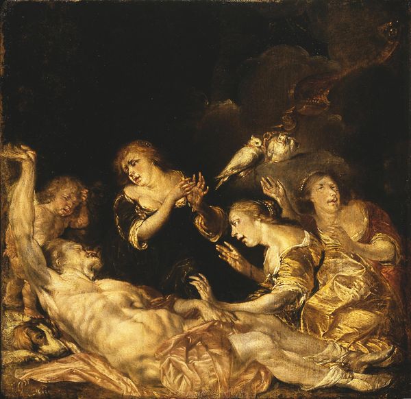 Editor: This is "The Capture of Samson," painted by Peter Paul Rubens around 1609-1610, using oil paints. It’s quite dramatic, almost theatrical. The figures are very dynamic. What's your take on it? Curator: For me, this painting speaks volumes about production. Consider the source of the pigments. Where did Rubens get those vibrant colors, and who ground them? Each shade tells a story of global trade and localized labor. Editor: So, you're saying the materials themselves are significant? Curator: Precisely. Look at the scale, too. Rubens likely employed assistants. How does the division of labor impact the "artistic genius" we traditionally associate with him? Did his assistants share their knowledge or techniques? How does that shared labor contribute to, or detract from, the individual "genius" attribution? Editor: I never considered the socio-economic side of making art back then. Curator: Also, what’s the context of oil paint in 17th century Europe? Its durability and relative ease of use revolutionized painting compared to earlier techniques. How does the rise of this particular material shape artistic styles and narratives? Think about the consumer, too; where would this painting be displayed, and who would have the wealth to commission such a work? What needs were Rubens and his contemporaries trying to meet? Editor: So much to think about beyond just the image itself! It changes how I view Rubens. Curator: Exactly! By focusing on materials and production, we uncover the intricate web of factors influencing art creation, moving past romantic notions of solitary genius to consider collective effort and economic realities.
