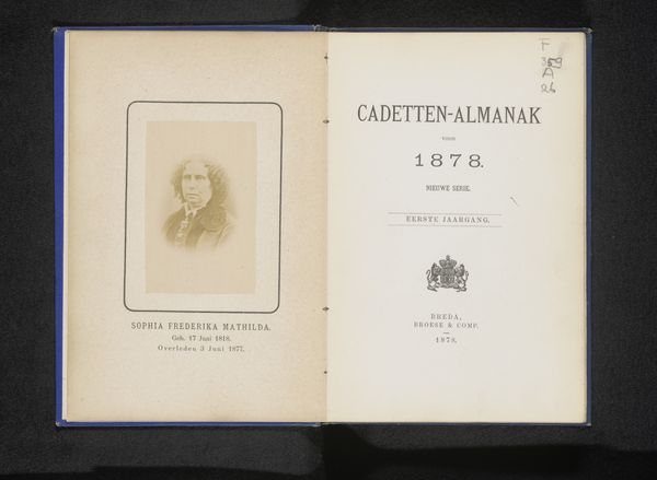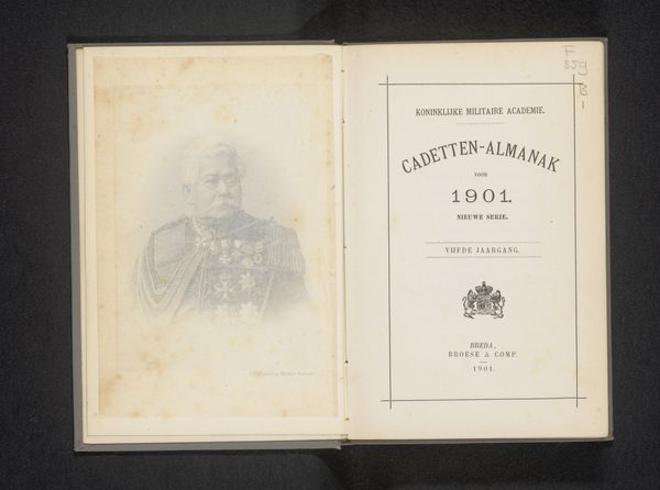 Editor: We're looking at a photographic print of a portrait of Hendrik, Prince of the Netherlands, sometime before 1902. It's bound within what appears to be the cover of an almanac. The image has a somewhat staged and formal quality, characteristic of portraiture from that era. What stands out to you when you look at it? Curator: I am immediately struck by the relationship between the photograph and the printed text beside it. Notice the contrast: the photograph presents a figure weighed down by ornamentation, whilst the text adheres to the clean, functional aesthetic often favoured in technical publications of this period. Observe how this juxtaposition directs our gaze and shapes our understanding of the figure's significance in relation to the academy, the site of this portrait's display. Editor: That's fascinating. So you're seeing a dialogue, or maybe even a tension, between the portrait's formality and the straightforward text? Curator: Precisely. One may read the two-page layout as a symbolic whole: the carefully controlled composition of the portrait acts as an advertisement of the school's authority, the guarantee of quality suggested through the technical capabilities used to render the image of Hendrik, Prince of the Netherlands. Consider the print's materiality as a vehicle carrying deliberate design. Editor: That reframes it entirely. I was initially focused on the portrait itself, but thinking about the design and how the elements interact makes the photograph much more powerful. Thanks for sharing your perspective! Curator: The power of visual expression lies in considering all components within an artwork. This has been illuminating for me as well.