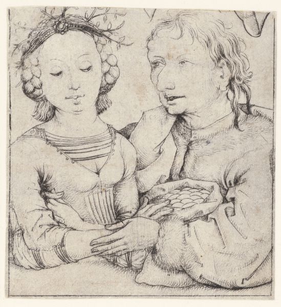 Curator: Here we have "An Old Woman and a Young Man," an engraving attributed to Lucas Cranach the Elder, dating from between 1515 and 1586. What springs to mind as you view this work? Editor: Well, I'm immediately struck by this peculiar dance of youth and aging—a bittersweet waltz where desire seems tinged with desperation. It's unnerving, like a fairytale gone sideways. Curator: The print certainly presents a provocative juxtaposition. Observe the meticulous detail in the rendering of textures, from the youth’s soft cap to the wrinkles etched into the old woman’s face. Note the strategic deployment of hatching and cross-hatching that delineates form and evokes light. Editor: It's almost as if Cranach is playing with ideas of mortality. She looks delighted, but it seems more about trapping youth in the promise of pleasure or wealth. The purse she's holding looks suspiciously significant, right? I sense this might be more transactional than tender. Curator: A keen observation. German Expressionism frequently utilizes stark contrasts to convey powerful emotional and symbolic narratives. The dynamic use of line contributes to this heightened expressive quality, revealing a society grappling with complex issues such as social hierarchies and the nature of beauty itself. Editor: Right, right. Cranach, in his Northern Renaissance way, digs into the weird, uncomfortable bits of life. It's not idealized; instead, it feels like peering into some dark corner of human longing, perhaps highlighting that even youth withers in the embrace of time or manipulation. I find myself pondering not just their ages but their agency here. Does the young man understand what this bargain means, I wonder? Curator: Precisely, such pieces served as potent socio-critical mirrors, sparking questions on ethics, morality and aesthetics among viewers then, just as it compels today. Editor: Well, it's certainly managed to poke me right in the sensibilities today. Thanks for lending such a sharp lens through which to view this print. Curator: Indeed. Examining such artistic creations prompts reflection not just on their period of genesis but their continuous echo within our ongoing human narrative.