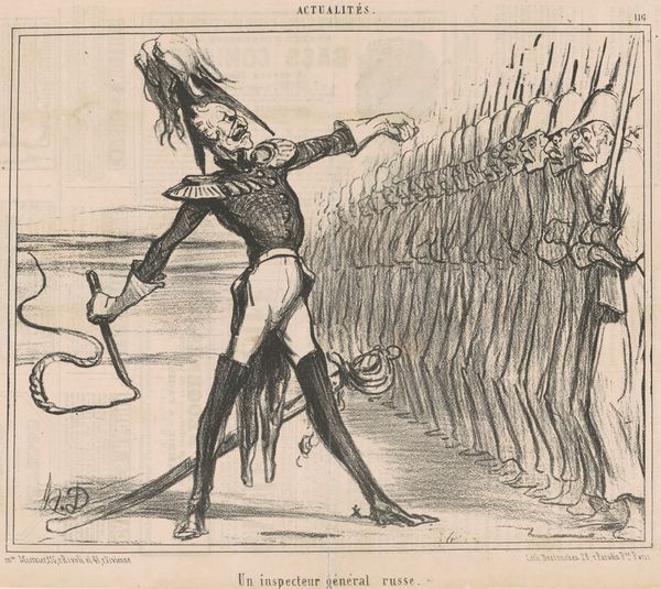 Curator: I find myself initially struck by the gauntness portrayed. There’s a tangible sense of deprivation, would you agree? Editor: Indeed. We're looking at a lithograph from around the 19th century by Honoré Daumier, titled "Soldats russes se préparant par le jeune et l'abstinence, à monter à l'assaut de Silistrie"—or "Russian soldiers preparing by youth and abstinence, to mount the assault on Silistria." It’s a sharp satire. Curator: Satire is putting it mildly! The skeletal figures, hunched over, embody a kind of forced asceticism. It’s a visual commentary on power structures and how they exploit bodies in times of conflict. Look at their weapons juxtaposed with their frail stature, as if their emaciation is some form of military advantage. Editor: The skeletal soldiers definitely present images of decay and depletion. Their tall, almost pointed hats, paired with equally slender spears or bayonets, certainly suggest the sharpness or even ruthlessness needed for the conflict in question. The officer's extravagant hat plumage is a very different symbolic direction—strength? Power? Curator: The officer is presented in stark contrast. Puffed up with pride and disconnected from the grim reality of his troops. The artist is questioning militaristic glory, juxtaposing it with the suffering upon which it is built. We see so much dark inking concentrated on the bodies of the ordinary men as a deliberate comment on the role that many citizens played as ‘cannon fodder.’ It underscores class divisions, doesn't it? Editor: Absolutely. And thinking about symbols of warfare: the title refers to their abstinence, yet are these truly virtuous qualities being depicted? It's meant ironically—more of a reflection on the deprivations and lack of substance inflicted by the political climate. Curator: Daumier certainly invites a reading about exploitation of bodies on so many different levels here, as soldiers were, and still are, instruments of political agenda. A lot of sacrifice and loss, as rendered with pointed emotional intention by the artist. Editor: It's an enduring image with layers of historical insight—quite potent.