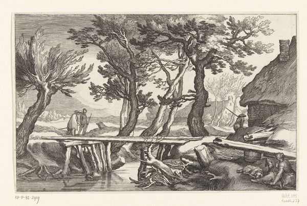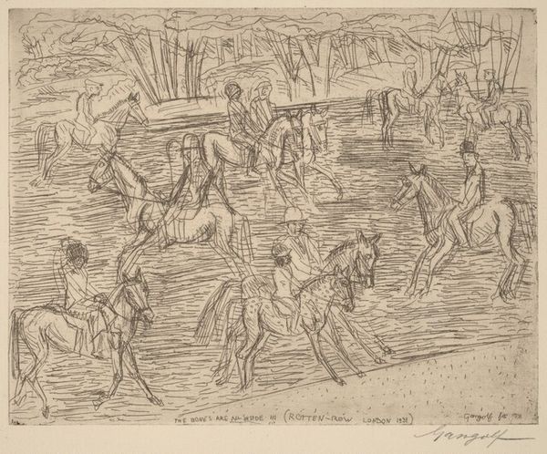 Curator: Let's discuss André Dunoyer de Segonzac's "Mediterranée" from 1934, a drawing rendered in ink and pen. Editor: Immediately, I'm struck by how teeming with life this scene is, almost frenetic. The light seems harsh, bleaching out some of the forms, creating an interesting interplay of positive and negative space. Curator: Precisely. The density of the lines varies across the composition, dictating form and light in such a structured fashion. See how the density resolves space, allowing Segonzac to play with our depth of field by pushing or pulling visual elements. Editor: Indeed, but it also amplifies the symbolic weight of this public bathing space as a gathering place. The figures seem both anonymous and distinctly individual. Public leisure represented with distinct individuality: it makes me think of a return to classical ideas, and the shared experience of culture, community, the ritualistic significance of water and bathing. Curator: An intriguing interpretation! Structurally, observe how Segonzac uses the receding planes—the foreground figures, the pier, the boats on the water, and the mountains in the background—to create a sense of depth. The overall effect showcases mastery of linear perspective in an interesting take of Impressionistic style. Editor: While perspective is clearly well established, what captures my interest is how these figures engage, or disengage, really. The paired individuals seem to perform a crucial role to suggest human relationships, like a psychological landscape: this pier isn’t just a physical object, it becomes a threshold. A cultural reference, if you will. Curator: I concede the point, the psychological implication of liminality is there; and I see now how his placement of those figures offers a lens. I am more persuaded now than I was at the beginning of this dialogue, I confess. Editor: Then the art worked its magic! Curator: The effectiveness lies in how these forms engage in conversation. Editor: Yes, it presents an interesting interpretation. I enjoyed looking at the work through your perspective.
