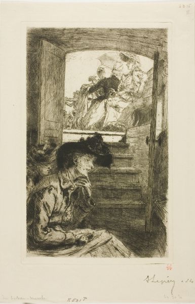 Robert Austin made this etching, *Girl on Stairs*, and the date is unknown. Look at how he’s built up the image with these tiny, delicate lines. It’s a slow, thoughtful process, like building a world one stroke at a time. What strikes me is the texture, or lack of it. Everything feels smooth, almost like skin, even the shadows. It’s all created with lines, but they blend together to create these subtle shifts in tone. See how the light catches her face, and the way the shadows pool behind her? It’s so gentle and intimate. Look at the little bunch of flowers she’s holding. They’re just a few scribbles, but they feel so alive. I’m reminded of Whistler, with that same sense of quiet observation. But Austin brings a different kind of tenderness to it. Art is about these conversations across time, echoes of feeling passed down through the years. It's a reminder that beauty can be found in the simplest of moments, in the quiet corners of everyday life.