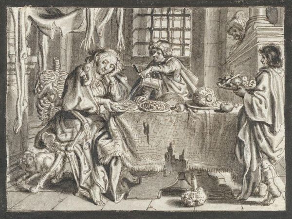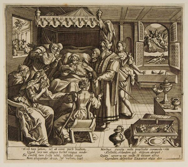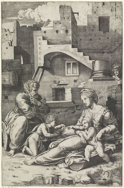 Editor: So, here we have "Holy Family" by Anton Wierix II. It's a detailed engraving. I'm struck by the almost mundane depiction of the Holy Family, like a domestic scene, but with this really odd dog. How does this image function within the broader context of religious art, do you think? Curator: It's fascinating how Wierix II utilizes the domestic to legitimize religious narratives. Consider the socio-political role of art during that era; prints like these weren't just devotional, but circulated ideas. Do you notice how the architecture through the door mirrors classical ideals? Editor: Yes, that is quite clever to frame the image in this manner. The text above the figures feels like a who's who of commissioning perhaps? Curator: Exactly. The text points to the collaborative nature of artistic production. It highlights the roles of both the "inventor," Franciscus Floris, and the engraver, Wierix, revealing the complex network of patronage and artistic labor that shaped the image’s creation and dissemination. Editor: That's a good point. It's not just about the religious scene, it's about who made it and for whom. Curator: Precisely! The image embodies both the divine and the very human act of creation and consumption within a specific historical context. I think that really underscores the power of prints in early modern society.