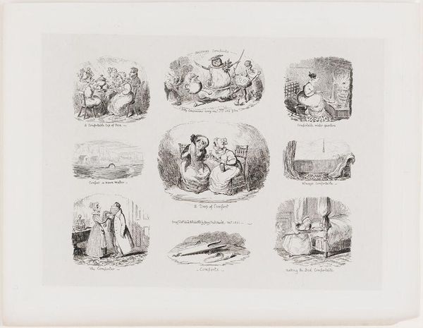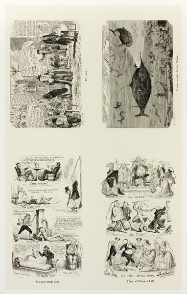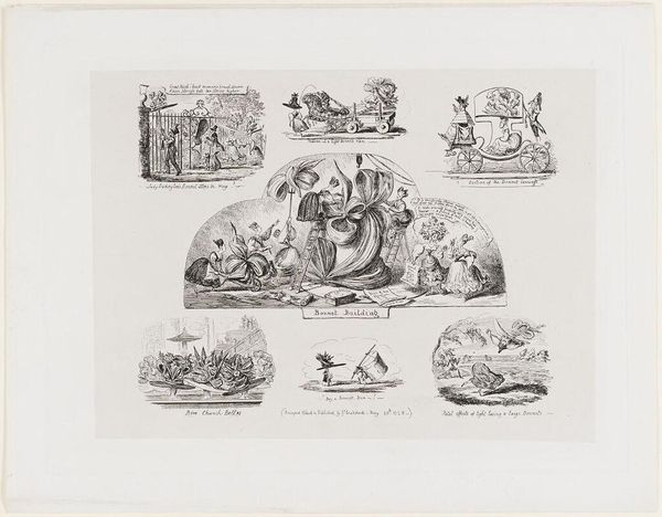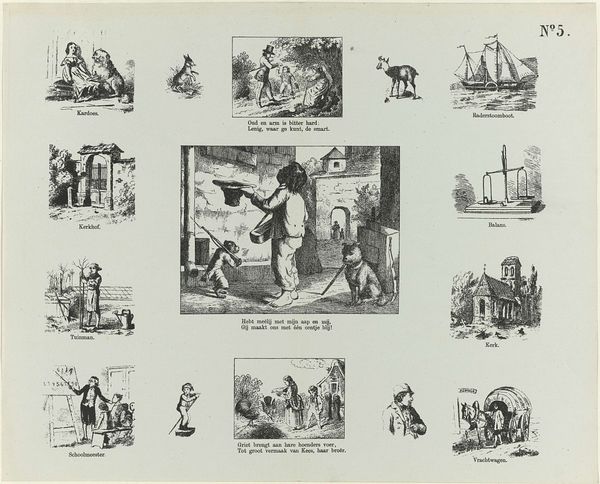 This print, “Verschillende taferelen,” was made by De Ruyter & Meijer using the technique of etching. This is an intaglio printmaking process, where lines are incised into a metal plate, which is then inked and printed. Etching is a technique that democratized printmaking in its early days, making it cheaper to produce images than engraving. The medium is defined by its capacity to create intricate linear detail, which we can see in the depiction of various scenes, from farmyard animals to landscapes. The use of line becomes a means of describing texture, depth, and atmosphere. The scenes depicted, from rural landscapes to everyday scenes, suggest a connection to the lives of ordinary people. The act of etching requires skilled labor, a deep understanding of materials, and meticulous execution, but its accessibility allowed for broader participation in visual culture, challenging traditional hierarchies between fine art and craft. Ultimately, “Verschillende taferelen,” invites us to reflect on the social, cultural, and economic contexts in which it was created.