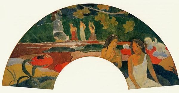 Curator: Looking at Romare Bearden's work "After the Bath," created between 1970 and 1973, I'm immediately drawn to the mood it evokes. There’s a sort of humid tranquility...the hazy light filtering through dense foliage. Editor: I see something different initially. To me it's unsettling. There’s a sense of vulnerability, a pre-colonial Caribbean or perhaps even imagined African space, but the gazes of the figures elude us. Who are these women and how did they come to be situated here within the modernist painting? Curator: Those women embody a recurring motif for Bearden – the Black female figure as muse and matriarch. Bathing is an age-old purification ritual, rich in artistic interpretations from classical to impressionistic depictions of the female form. Here, he synthesizes that archetype through a decidedly Black lens. The overall composition creates a feeling of entering a sacred space... Editor: Precisely. This echoes Bearden’s commitment to challenging racial hierarchies in art, to insert Black figures into that "sacred" canon which has systemically excluded them. Considering the dates this watercolor painting was produced, this work is situated directly amid the Black Arts Movement, which sought to reimagine Black identity beyond the bounds of white representation. Bearden invokes these layered symbolic histories. Curator: You see, that interplay is essential, isn't it? These figures feel timeless, almost iconic, but they're very specifically placed within this vibrant landscape of greens and earthy tones. I read echoes of Gauguin, and his paintings of Tahitian women. There’s even that bright celestial orb. A moon, or maybe the sun in its descent or rise above the figures. Editor: Right, but let’s push that further – Bearden's art, at its heart, is about claiming space and resisting erasure. Here, he resists dominant narratives by decentering them, in pursuit of centering Black women, positioning them both within and defiantly outside of that history. What would they have thought of Gauguin, I wonder? How would the feel of their bodies changed during the long trip, on a ship across the waters of the Middle Passage? Curator: This image holds within it generations of symbolism, it makes you pause, consider. And maybe to see it in its own specific light. Editor: Absolutely, and to grapple with its complex layers, refusing any singular or straightforward reading. It embodies art's power to unsettle and provoke crucial dialogue across time.