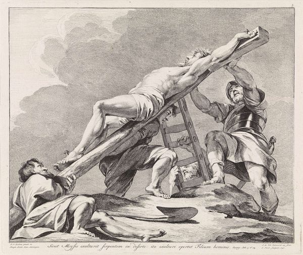 Curator: Here we have Rembrandt van Rijn’s “The Elevation of the Cross” from 1633. Executed in oil paint, this compelling work is currently held in a private collection. Editor: The first thing that strikes me is the oppressive darkness; the artist has constructed a composition that amplifies the visual drama. It has a deeply mournful tonality. Curator: Indeed. Note the strategic use of light and shadow, what some scholars call 'tenebrism.' Rembrandt masterfully employs chiaroscuro to direct the viewer’s gaze, drawing attention to Christ's illuminated body against the murky backdrop. The sharp contrast heightens the emotional intensity. Editor: And what about the characters surrounding the central figure? We have individuals pulling ropes, and others, half-seen in the darkness, staring at Christ being hoisted upwards. There’s a roiling, barely controlled emotional landscape among them. Is there an attempt to universalize or emphasize particular historical elements within their costuming, stances? Curator: Precisely. Consider, too, the cross itself – not just a structural element, but also an emblem, representing sacrifice, redemption, and immense suffering. By capturing the moment of elevation, Rembrandt invites contemplation on these intertwined concepts. This moment embodies humanity’s spiritual ascension through an act of immense brutality. Editor: It certainly forces one to consider that in nearly every culture the sky, air, upper atmospheres or highest point available is associated with notions of the divine, the seat of deities, the realm from which salvation comes to people down below. Curator: And as for the costuming – this is no historical re-enactment, mind you, so as we analyze each figure within the pictorial field, let us consider that Rembrandt has deployed the figures to amplify the human drama of what is unfolding. Editor: I find myself contemplating not just the figures themselves but the space *between* them—the oppressive, unspoken weight that charges the scene with unbearable suspense. Curator: Precisely! Ultimately, "The Elevation of the Cross" offers a potent interplay between faith, light, and our mortality through remarkably rigorous visual expression. Editor: Thank you, now when I reflect upon it, this image speaks to me about how tragedy may itself carry some sort of promise.