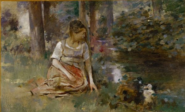 Editor: We're looking at "Alone in the fields" by Noè Bordignon, an oil painting from 1900. What strikes me is its quiet intimacy – a young woman seemingly lost in thought, immersed in the landscape. What do you see in this piece? Curator: It's interesting you highlight the intimacy. I'm immediately drawn to the social context implied. Notice the plein-air style – painting outdoors became increasingly popular, reflecting a shift in artistic values, and changing class structures. It offered new representations of rural life to an urbanizing population. Does her placement on the edge of the field suggest a literal or metaphorical boundary? Editor: That’s a good question. It almost feels like she's caught between the rural world and something beyond it, maybe urban life or some different prospect. I hadn’t thought about that tension. Curator: And how does the artist choose to depict her? She isn’t idealized. Her bare feet and simple clothes portray working class status, contrasting starkly with traditional depictions of female figures in art. Could the 'aloneness' in the title reflect broader feelings of marginalization or independence? Editor: So, the painting is more than just a peaceful scene. It also carries a social narrative about changing times and the place of women. I see it. Curator: Exactly. And think about how the Romantics had been exploring concepts of individual consciousness against the grandeur of nature decades earlier. The artist creates tension through social reality painted within an established style. Editor: This has totally changed my perspective. What looked like a simple portrait is actually loaded with commentary about society at the time! Curator: Absolutely. This piece reveals so much if we consider its place within art history. I think this gives both a wider appreciation.