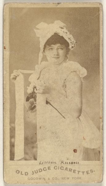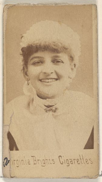 Curator: At first glance, the image reads like a vintage photograph, soft focus and sepia tones, presenting a woman with an engaging half-smile. It is, in fact, a card from the Actors and Actresses series, specifically "Card 430, Minnie Palmer" produced for Virginia Brights Cigarettes around 1885-1891. Editor: It's incredible how an item designed for mass consumption also acts as a window into the Gilded Age, an interesting collision of art, advertising, and celebrity culture! I see how the texture from the print and potential hand-coloring adds layers of information beyond the image itself. Curator: Exactly. Allen & Ginter, the producers, aimed for a particular type of consumer. Consider how the manufacturing and distribution of such cards reflect the industrial expansion and advertising strategies of the time. Editor: And how these strategies shaped the image of femininity for public consumption. Minnie Palmer is presented in this idealized, almost saccharine fashion, indicative of prevailing social attitudes toward women in the entertainment industry. Were these cards exclusively for a male demographic, solidifying certain performative standards? Curator: That’s a great question! While tobacco consumption wasn't gender exclusive, the marketing probably was, reinforcing the patriarchal structures in place. These weren’t intended as “high art,” they were inserts meant to protect cigarette packs that incidentally celebrated actors. They made art accessible at a mass level. The interplay between craft and commercialism is fascinating. Editor: Indeed! The card isn't just an image, but also a piece of cultural ephemera. The photograph, transformed through the printing press, and sold along with cigarettes, becomes embedded within social narratives and the construction of fame at that time. It raises the question of who profits from such commercial depictions. Curator: And the implications of these processes on the actress herself. It reveals how labor and artistic mediums transform a portrait into a commodity, altering her public persona. Considering the context—labor, materials, celebrity culture, commercialism—it's pretty rich in content. Editor: Seeing this portrait card provides us with a small but important reminder of a complex period when social trends and popular culture combined and intermingled to construct images with powerful public and political implications. It really reveals so much about art, commerce, and gender in the late 19th century.