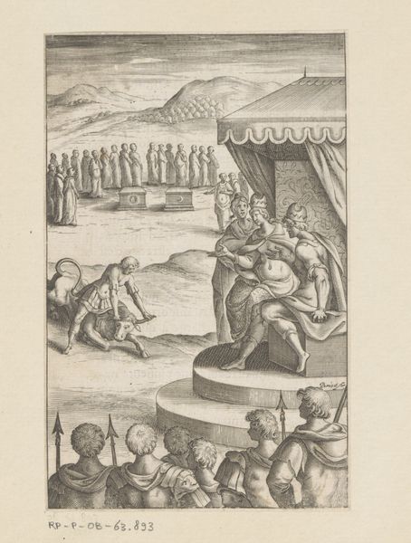Curator: Looking at this print, "The Raising of the Copper Serpent", made between 1579 and 1643 and attributed to Johann Sadeler I, the first thing I notice is the dense composition and swirling energy. It’s quite striking. Editor: Yes, the figures are so interwoven, and rendered meticulously. I'm thinking about the material process of its making. It's an engraving, after all, which demands careful control over the metal plate. We see the skilled labor that went into its production through the precise incisions, how this relates to workshop practices of the time, and printmaking’s place in image distribution. Curator: Precisely. And let’s consider its visual politics: the piece illustrates a biblical episode, right? Moses erecting a bronze serpent to heal the Israelites from snakebites. The print makes that divine intervention accessible to a wider audience at a time when religious imagery had significant power and, in some contexts, was contested ground. Editor: Good point. I am very intrigued by that coiled copper snake. Look at the way it spirals upwards – it acts almost as a kind of fetish object but also as a channel for a transfer of material agency: a mediation for this kind of promised salvation through that raw metal. The body as a material agent is at work also; they are bitten, sick, then healed—so interesting. Curator: Absolutely. The physical forms of suffering are really present – some writhe, others are supported by companions and gaze desperately. Consider how the politics of imagery influences interpretation, especially during periods of intense religious change; its impact, use, and dissemination are important factors of the cultural environment. Editor: This act of observing the statue to receive healing is powerful—an artistic expression exploring not just narrative, but this connection through materials that might otherwise cause harm, and through human will or belief can be the vessel for miraculous salvation. Curator: So true. It all reinforces how profoundly religion and art became intertwined historically. "The Raising of the Copper Serpent," through the circulation of these prints, solidifies that interconnection by displaying complex social-political tensions that can affect people. Editor: By analyzing that intricate method used in engraving alongside social messaging, it provides more insight into societal issues. Curator: What this artwork represents, it allows a broader and further social interpretation.