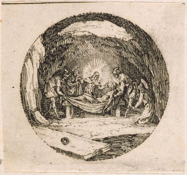 Curator: Look closely at Jacques Callot's miniature etching, "Christ in Limbo." It's incredibly small, barely larger than a postage stamp. Editor: My first impression is its stark, almost frantic energy, despite the diminutive scale. The composition feels dynamic, a vortex of figures. Curator: Indeed, the composition funnels our gaze from the lower left corner, where figures emerge, towards Christ at the center. Note Callot's mastery of line. The etching technique creates a sense of depth and texture. Editor: And consider the Counter-Reformation context. Images of Christ's descent into hell served to emphasize the Church's role in salvation during a time of religious upheaval. Curator: Precisely. The socio-political pressures shaped the iconography. However, the technical virtuosity evident in the hatching and cross-hatching transcends mere propaganda. It stands as a testament to Callot's observational skill. Editor: Ultimately, it reveals the complex interplay between artistic expression and societal forces. Curator: A convergence worthy of continued attention.
