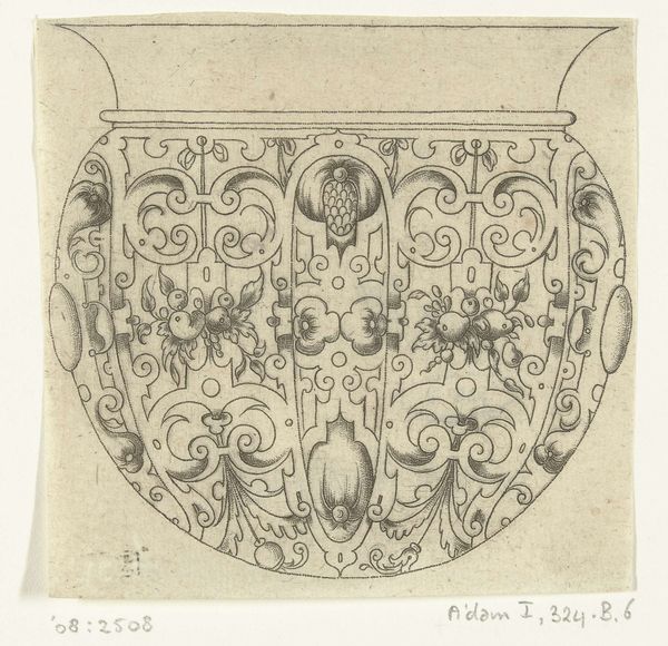Laurent Jansz Micker created this print, "Spits met bloemenvaas, draken en fruittrofeeën," using etching techniques. During the early modern period, the circulation of ornamental prints played a crucial role in the dissemination of artistic ideas and styles. Micker's print reflects the cultural embrace of classical motifs in the Netherlands at the time. The symmetrical arrangement and decorative elements evoke a sense of idealized beauty but also order. The combination of flowers, vases, dragons, and fruit suggests a world where nature and fantasy intertwine, creating a harmonious yet dynamic visual experience. What does it mean to see dragons juxtaposed with such delicate floral arrangements? Does this combination evoke a sense of power, magic, or something else entirely? Micker uses detailed designs and symmetrical compositions to create something beautiful and inspiring.