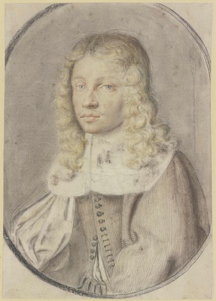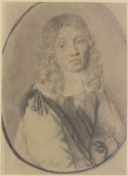 Curator: Gazing at us from across the centuries is Cornelis de Witt, in a portrait rendered in charcoal by Jan de Baen. It's currently held in the Rijksmuseum and believed to have been created somewhere between 1643 and 1702. What do you make of him? Editor: Immediately, I notice the gentleness in the drawing, an almost ethereal quality. The soft reddish-brown charcoal gives it a warmth, but there's also a certain melancholy hanging in the air. He seems… resigned, perhaps? Curator: I get that! There's definitely something in the eyes, a world-weariness that transcends the formal portraiture of the era. I wonder what Baen was thinking when capturing this, it seems far more intimate than simply documenting de Witt's likeness. I sense a subtle critique of power. Editor: Absolutely, and we can’t ignore de Witt’s own tumultuous story, executed in 1672 for supposedly plotting against William of Orange. Does that context colour our interpretation? I mean, does knowing this cast a shadow on the portrait's perceived sadness? Does the art anticipate the end? Curator: I suspect that to read the portrait as directly predicting that horrific end would be too much of a stretch! I can't imagine that de Baen was necessarily consciously foreshadowing it, even with art's remarkable foresight now and again, but maybe his keen observational and interpretive artistic self may have picked up on it. His eyes suggest he sees quite clearly, perhaps *too* clearly. Editor: Indeed, because he isn't staged in front of something pompous to show his power and standing, instead he's wearing this intricate lace collar which brings so much grace and almost sensitivity to the historical role of sitter and painter, and that in itself brings its own set of historical and cultural connotations. Curator: I see that tenderness as something human and incredibly accessible even today! The beauty is perhaps that he almost stares beyond the drawing itself! Perhaps a mirror is to thank! I almost wonder what *we* ourselves have reflected into *his* face in all the intervening years of our gazing… Editor: So perhaps it functions like a Rorschach test where historical traumas of that age keep being exposed. So many layers of perception! Curator: Right?! It remains potent even centuries on because ultimately it speaks to us! De Witt is still very much present and Baen gave him that presence and a sensitivity that few were party to! Editor: Yes! This small work contains a universe.