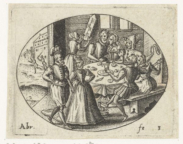 Curator: Look at this fascinating print, “Exempel und Lehr Jetziger Welt Lauf,” thought to be from around 1622, made by Andreas Bretschneider. It's rendered as an engraving and etching, which really emphasizes its narrative density. Editor: It certainly does. My first impression is…claustrophobic. So much packed into one small scene, a gathering of some kind. The sharp lines of the etching make the whole image feel stiff, almost tense. Curator: Absolutely. And the title is quite revealing, loosely translating to “Example and Lesson of the Present World.” Bretschneider seems intent on illustrating, perhaps critiquing, contemporary social behavior. Notice the various groupings within the tavern scene. What aspects of its production catch your eye? Editor: The printmaking process itself is key. Engraving and etching, mediums reliant on mass production, perfectly suit a moralizing artwork intended for broad consumption. I'm wondering who the intended audience would have been. This intricate level of detail also implies that this was accessible to wealthier bourgeois buyers. Curator: Good point. I'd argue that the relatively low cost of prints allowed for broader circulation than paintings. Consider the symbolism employed. The embracing couple, the figure raising a glass, even the people occupied with other tasks—how might these individual elements coalesce into a social commentary? Editor: The scene feels like a condensation of moral decay. Each group engages in some kind of transgression. The embracing couple are a little too intimate, perhaps signifying lust. And I am also really intrigued by that figure just peering through the window there as though voyeuristically observing some impropriety in action. Curator: I see your point! The very *act* of observation, distribution, and the subsequent consumption of imagery like this shapes public perception, wouldn't you say? The act of looking creates its own discourse and contributes to constructing social norms. Editor: Precisely! This artwork isn't just *reflecting* societal mores but is actively involved in the politics of imagery by reifying accepted roles and behaviors in everyday life. Curator: Well, examining "Exempel und Lehr Jetziger Welt Lauf" has given me a new appreciation for how printmaking, especially through the work of Bretschneider, allowed for social commentary and ethical considerations to be visualized and consumed on a grand scale. Editor: Indeed! It is important to look at works like these, so heavily embedded within socio-historical circumstances, and contemplate their ongoing effect. It really forces us to think critically about image distribution and our current world.