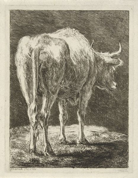 Curator: Here we have Paulus Potter’s etching, “Standing Cow,” created sometime between 1639 and 1677. Look closely at the rendering. Editor: It's... understated. A solitary cow, really the only subject. Starkly presented in this monochrome landscape. Makes me think about agrarian life, somehow idealized and brutally real at once. Curator: Potter elevates a farm animal to high art, a reflection of the Dutch Golden Age's mercantile success tied inextricably to its agrarian roots. What symbolic weight do you think such an image held for its contemporary viewers? Editor: Well, cattle were more than livestock; they were capital, a visual shorthand for wealth, prosperity, and national identity. The serene pose contrasts with the often harsh realities of animal husbandry, creating a potent symbol. Curator: Exactly! The scale is crucial. Consider how a commonplace animal is blown up, granted gravitas. This emphasizes the nation’s investment and pride. But then, how do we reconcile this with the, frankly, somewhat emaciated condition of the animal? Is this idealized or critique? Editor: That’s what I mean by brutally real. It’s interesting how this tension persists, the ideal and the lived experience existing together. Is there perhaps a visual pun? I mean, "cattle" also can mean possessions in the most basic way? Curator: Possibly. It’s a clever interpretation, fitting nicely into the complex, multifaceted understanding a work like this invites. Editor: A deceptively simple image reflecting on the agricultural prowess of a young nation finding its footing, claiming visual territory. I see power but also some level of melancholy here. Curator: And there’s the continuity of imagery—the echo of ancient pastoral scenes recast for a modern, upwardly mobile society. Potter provides a powerful mirror to that era. Editor: It certainly holds up to scrutiny, this deceptively quiet cow, embodying wealth, health, national pride, and the inherent tension between idealized images and earthly realities. Curator: Indeed, an exceptional piece for appreciating the intricacies of the period's visual lexicon.