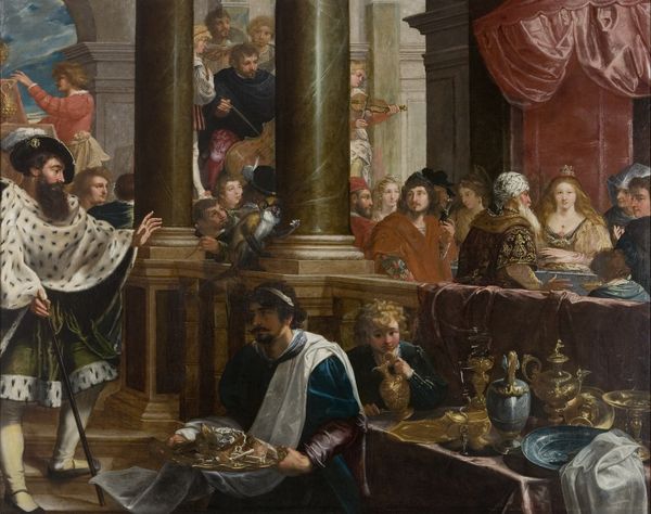 Curator: Stepping back, I'm immediately struck by how intimately this scene is rendered—the textures, the light... it almost feels like theater. Editor: This Baroque painting, "Christ Washing the Feet of His Disciples" by Nicolas Bertin, dating from 1720 to 1730, certainly stages the scene, you’re right! The composition is theatrical, but also quite fraught with questions about power and servitude. Curator: Absolutely! Look at Peter recoiling—like, "No way, dude, not MY feet." There's real human emotion tangled up in this divine gesture, a humility that unsettles the expected hierarchy. And, wow, those fabrics. So fluid. Editor: The Baroque loved those dramatic flourishes! The lavish folds draw your eye to the core drama: Christ, as a subversive figure, enacting a ritual of radical egalitarianism. Washing feet was a task usually reserved for the lowest of servants, a gesture that challenges societal norms. Curator: Exactly, and the artist has so brilliantly captured this reversal—the discomfort, the realization dawning on the disciples' faces, the slight protest, almost… awkwardness? You see what I mean about the textures; they create a compelling, yet delicate contrast of divine and earthly roles and expectations. Editor: That “awkwardness,” I think, reveals so much about the construction of masculinity within that period—a real challenge to traditional models of dominance, especially considering their historical moment of empire and social hierarchies. Curator: Hmm. Never really thought about it like that before. But the more I linger with it, I’m more and more amazed by Bertin’s boldness in humanizing these mythic figures... giving their hesitation real presence, and a really striking level of self-awareness for its time. Editor: Bertin pushes us to really contemplate these moments of transition. Ultimately, this artwork provides a rich perspective, layering questions about power, gender, and the messy process of transformation. Curator: Well, you’ve made me appreciate even more than before its raw complexity— the audacity to make this vulnerable. What began for me as a simply "wow, what stunning craftmanship!” ended as quite something entirely other… a deeply moving lesson on challenging boundaries.