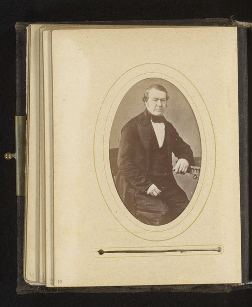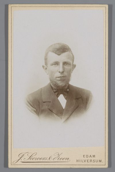 Curator: This portrait, entitled "Portret van een man met ringbaard", or "Portrait of a man with a circle beard", comes to us from somewhere between 1883 and 1887 and is credited to Godfried de Jong. Editor: My immediate impression is of intense dignity mixed with an undeniable melancholy. The aged paper adds to the feeling that this image holds a heavy history within it. Curator: Absolutely. Early photographic portraits like this, especially from the late 19th century, often aimed to convey respectability and status, which was relatively novel at the time. The gentleman's formal attire—the jacket and bow tie—underscores this aspiration. Editor: True, but I'm also seeing a certain rigidity, perhaps enforced by the long exposure times, which probably were very uncomfortable and maybe created an environment that affected this gentleman deeply. It's fascinating how the photograph serves as a document not only of appearance but also, indirectly, of the socio-cultural pressures of the era. Curator: Think about the ring beard itself, it would have carried symbolic weight. Facial hair, especially among men, was often used to signify strength, wisdom, and social standing. Editor: Did you notice his gaze? He is not giving the camera a reassuring smile like portraits today would call for. Rather, he offers this stern face—the kind of look that might reflect deeply held societal norms about masculine identity and emotion. His identity would seem almost impossible for a contemporary viewer to reconstruct in full. Curator: And the format—a mounted photograph likely meant for an album—speaks to a desire for preservation, to create a visual family history. This reflects broader cultural values around lineage, legacy, and the creation of a tangible past. Editor: Looking at the toning of the paper, the wear around the edges, it feels like holding a fragment of a lived experience. His photograph has weathered countless hands, each turn adding depth and complexity to what we see. The picture tells a story, that seems to me a history in and of itself. Curator: Exactly, and tracing those echoes allows us to connect with both a specific individual and the wider patterns of cultural and psychological expectations prevalent during that period. What we consider worth remembering? That’s the magic to it all. Editor: Agreed. By focusing on those symbolic echoes, and interrogating the historical forces at play, we reveal not just the image of a man with a beard but an enduring piece of ourselves and our societal condition, still seeking resonance through the past.