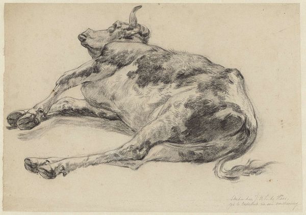 Guillaume Anne van der Brugghen created this drawing of a resting ox with graphite. Here, we see the animal lying down, embodying a sense of calm. The ox has been a symbol of patience and strength through the ages, a motif that stretches back to ancient times, appearing even in cave paintings, representing the untamed power of nature. Across cultures, from the bull of ancient Crete to the sacred cows of India, the ox has been a recurring figure. This symbolism has been passed down, continually adapting. In Christianity, the ox is associated with Saint Luke, embodying sacrifice and service. Consider how this image might tap into our collective memory, stirring something deep within us—perhaps a subconscious connection to our agrarian past, to the rhythms of nature, or even to the primal forces embodied by this powerful yet docile creature. The symbol of the ox echoes through history, each time carrying new layers of meaning while also retaining echoes of its ancient significance.