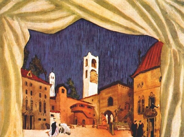 Curator: Here we have Nicholas Roerich’s watercolor painting "Pskov," created in 1935. It resides at the Novosibirsk State Museum of Fine Arts in Russia. Editor: The overall effect is one of quiet, almost reverential awe. The pale washes of color give it a dreamlike quality, and the architectural shapes have a simplified, geometric presence that feels solid, despite the medium. Curator: Indeed, Roerich was deeply invested in Russian history and spiritual traditions, often using architectural motifs as symbols of cultural endurance. He participated actively in the Russian Avant-Garde movement, contributing significantly to stage design and embracing its principles in his easel painting, which often reflects folk art aesthetics. Editor: The imagery strikes me as powerfully evocative. I notice the character bearing an axe, situated in front of the pale church building. Is that perhaps St. George, bearing the iconic symbol of battle against destructive forces, an attempt to guard cultural identity in times of social changes? Curator: Interesting speculation. Remember that during this period, the Soviet government’s attitude toward religious sites was complex and frequently destructive. Some churches were preserved, but many others were repurposed or demolished. Perhaps the character, St. George, signals a sense of custodianship, of safeguarding Russian cultural heritage. Editor: It does evoke the feeling of guarding something precious, something on the verge of being lost. There's an urgency embedded in this serene scene, isn’t there? That’s why it feels relevant and emotionally impactful for a contemporary viewer. Curator: Roerich’s painting illustrates a connection to Russia's spiritual and artistic legacy. He presents a dialogue between past and present, which might also reveal Roerich’s position on art’s social role. He certainly wanted it to preserve cultural identity and national consciousness. Editor: Seeing the layers of history, belief, and anxiety interwoven in such a deceptively simple scene enriches the experience immeasurably. Roerich leaves us to contemplate this landscape with new eyes.
