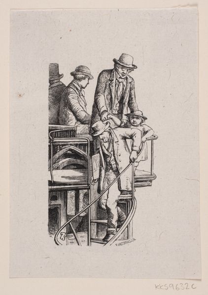 Curator: Here we have Paul Gavarni's "So loan me one hundred sous, mother." Editor: It's stark—the lines so precise, creating a somber mood despite the harlequin figure. Curator: Gavarni's works often satirized Parisian society, and this one speaks to economic desperation. The harlequin, a figure of comedy, is reduced to begging. Editor: The composition draws my eye—the stovepipe mirroring the figure’s slumped posture, creating a visual echo of despair. The stark ink amplifies the mood. Curator: Absolutely. This print underscores the harsh realities beneath the veneer of gaiety, revealing class struggles. Editor: I find the artist's strategic use of shading gives a real sense of depth, intensifying the emotional weight of the image. Curator: It leaves one contemplating the cyclical nature of poverty and performance. Editor: Indeed, it forces us to consider the artist's technical skill in creating such emotional resonance.