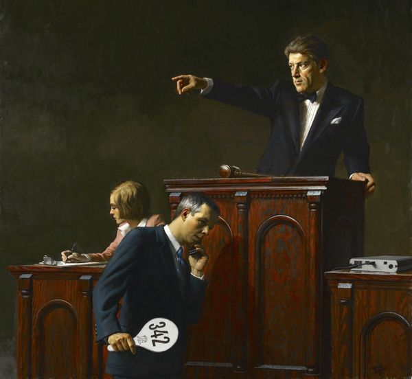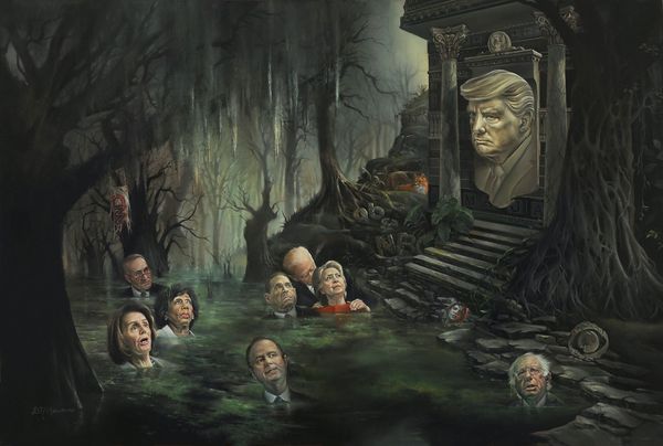 Jon McNaughton's "The Demise of America," of unspecified date, presents a scene rendered with meticulous detail in oil on canvas. The painting's composition is dominated by a dichotomy of light and darkness, where the warm tones of the fiery background clash against the cool, subdued palette of the foreground. The central figure, positioned almost as a sculptural form, draws our eye through the contrast between the sharp lines of his suit and the organic chaos of the burning landscape behind him. The use of chiaroscuro not only enhances the dramatic effect but also invites a semiotic reading: the figure's calm demeanor set against the backdrop of destruction may function as a signifier of detachment or culpability. McNaughton manipulates depth and perspective to create a space that feels both immediate and symbolic. The material qualities of the paint, with its visible brushstrokes, add texture that enriches the visual narrative. This interplay of form and content offers a space for ongoing interpretation, prompting us to question the values and cultural codes embedded within the artwork.